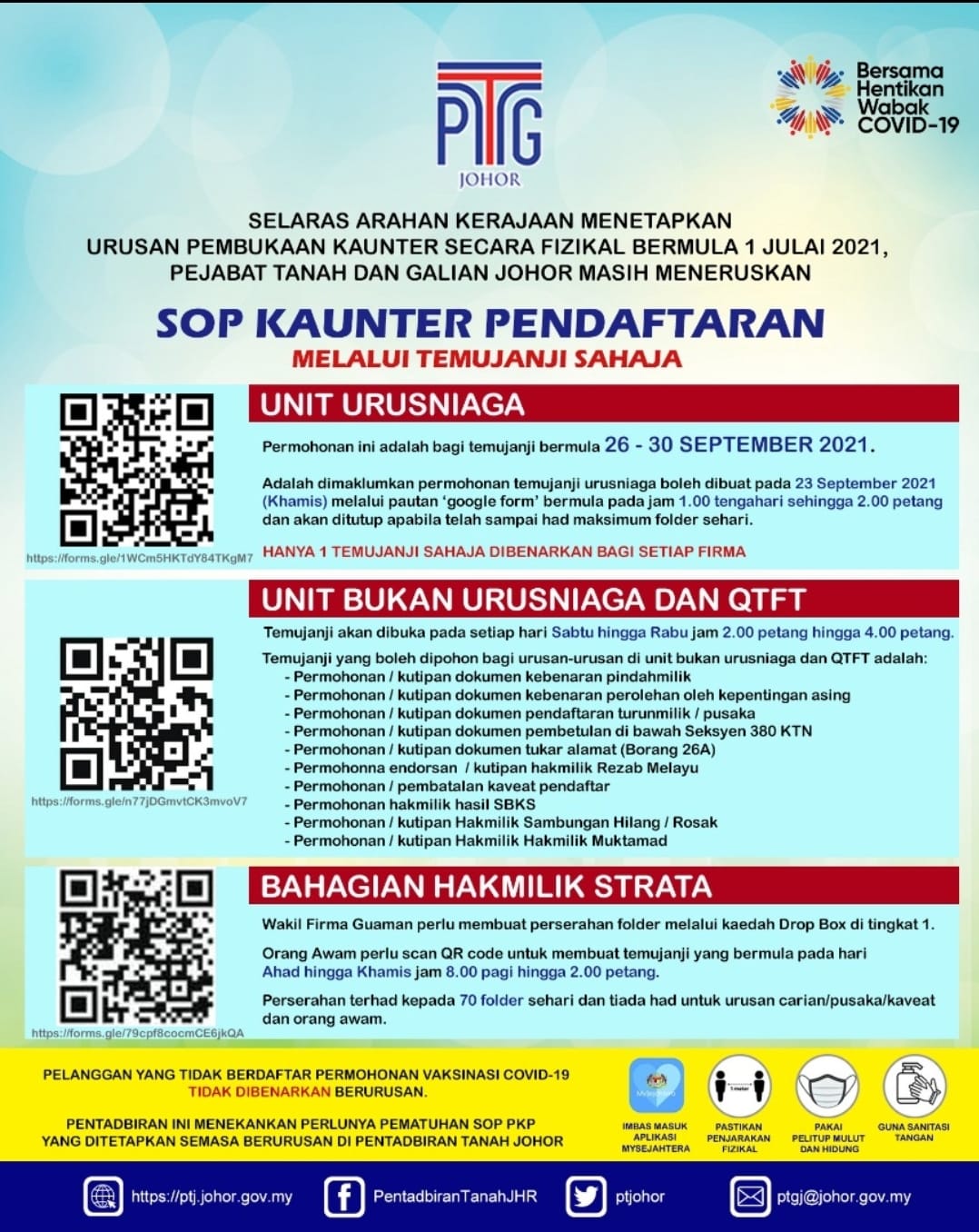 Pejabat Tanah Dan Galian Johor On Twitter Adalah Dimaklumkan Permohonan Temujanji Di Bahagian Pendaftaran Hakmilik Di Unit Urusniaga Bagi Firma Firma Di Dalam Negeri Johor Unit Bukan Urusniaga Dan Qtft Dan Di Bahagian